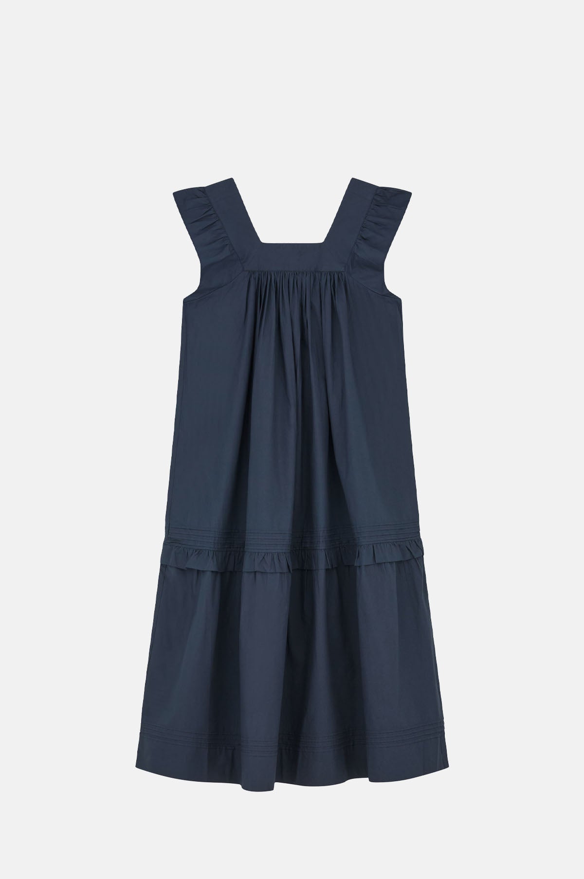 Eminently wearable, the Alina Dress is trimmed with ruffles and delicate gathers that make it wonderfully romantic. With plenty of volume and fully lined, this ankle-grazing navy dress has a square neckline and side seam pockets. Perfect for wearing to a picnic on a summer's day with a basket bag in tow.