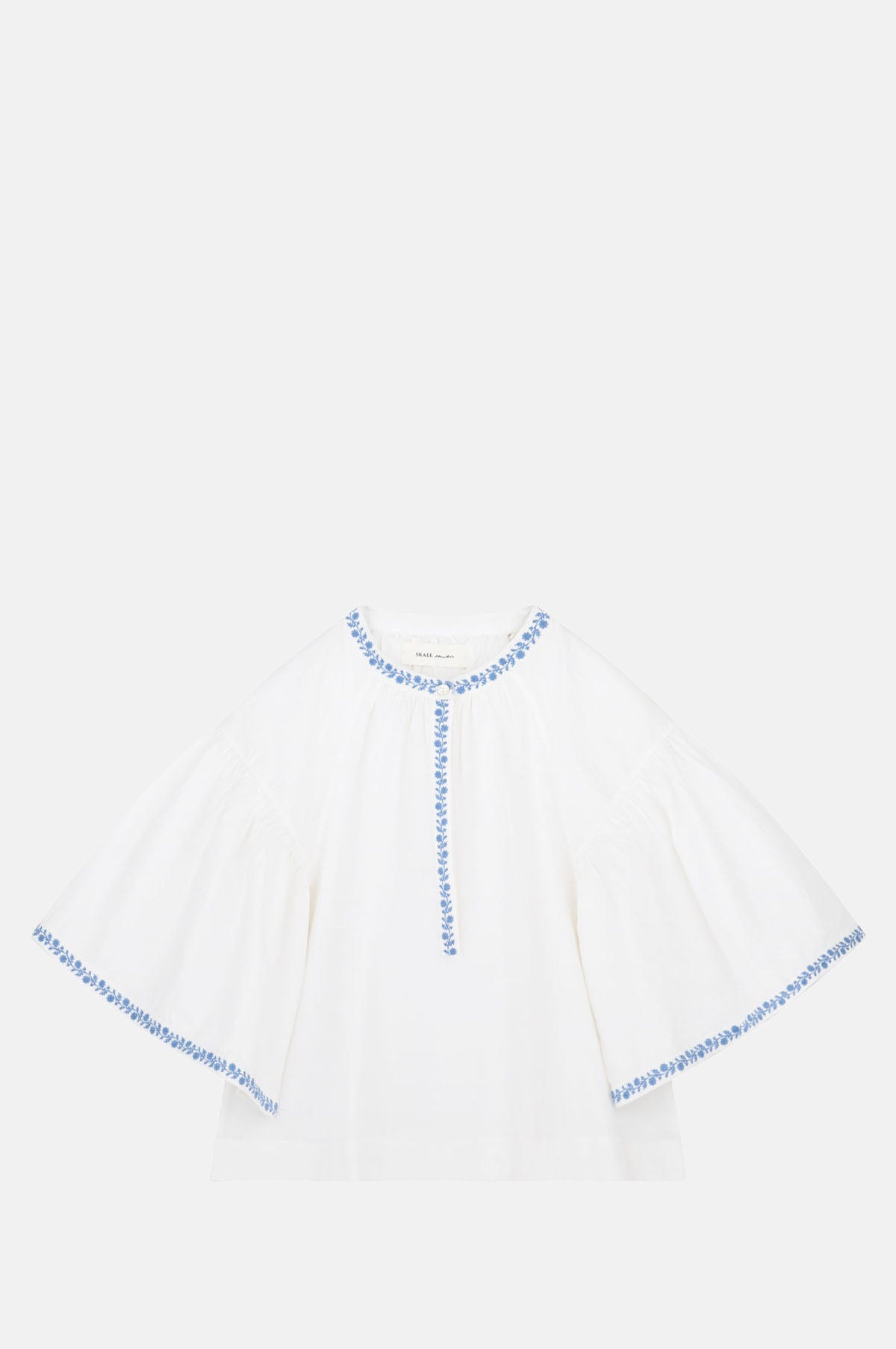 This vintage-inspired blouse from Skall Studio is an elegant piece for summer that is spun from an airy white cotton poplin. With voluminous half-length sleeves, it features a covered button placket, round neck and has a cropped, boxy fit. Delicate blue floral embroidery trims the sleeves and collar. We will be pairing our Bonne blouse with jeans and Mary Jane's.