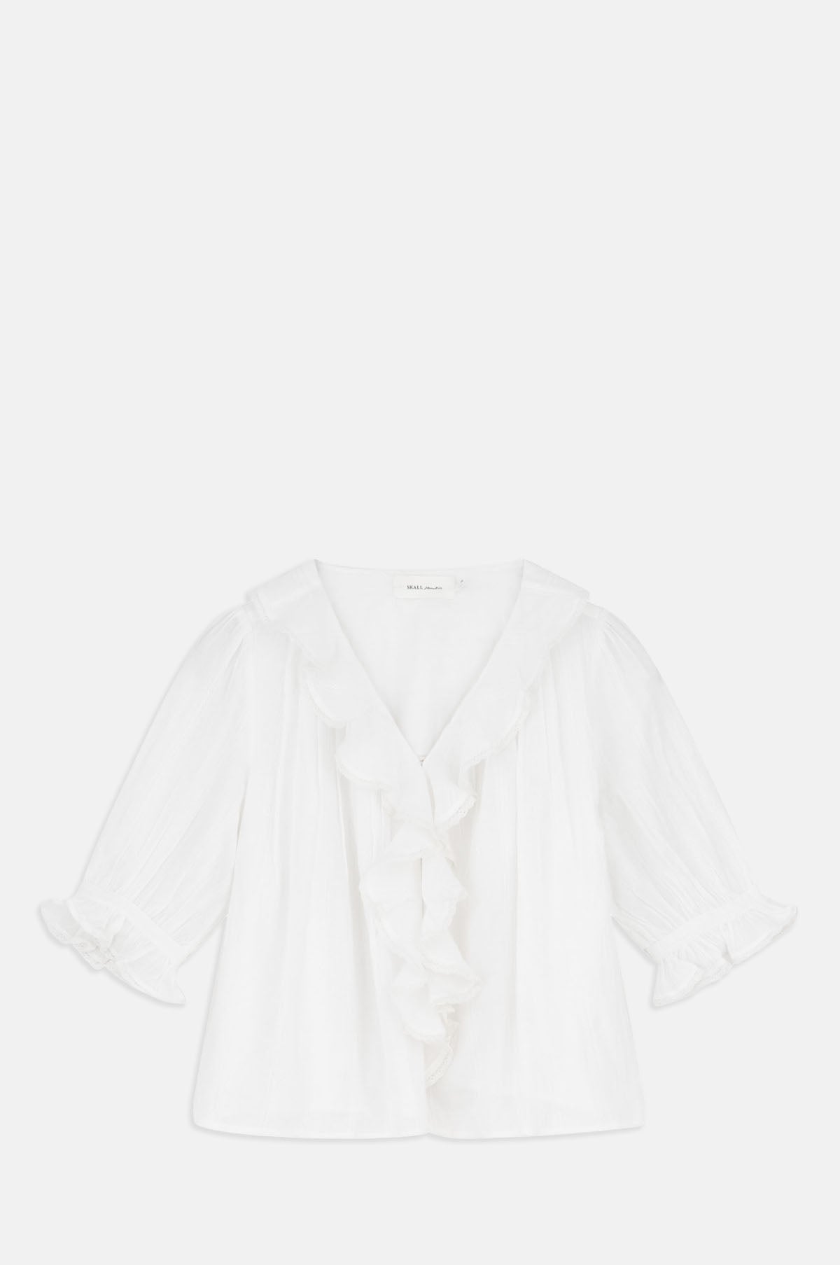 The Clea blouse is the softest voile cotton top abundant in romantic details. Framed by half-length puffed sleeves that are trimmed with lace which is echoed in the body of the blouse with tonal lace inserts that stripe the fabric. Pleating falls from the back yoke to provide volume, mother of pearl buttons fasten the blouse and a ruffled v-neck completes the design of this pretty white blouse.