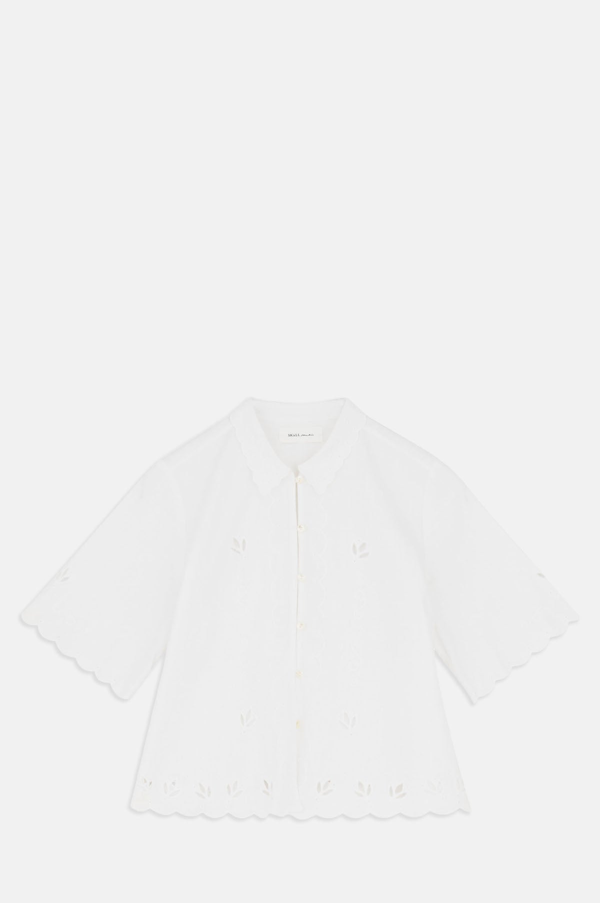 Ever so pretty, the Fleurie Shirt is detailed with tonal embroidery and cut details that make it wonderfully romantic. Crafted from a breezy white linen and cotton blend and cut for a boxy fit, it is framed by short sleeves and trimmed in a shallow scallop. A line of mother of pearl buttons fastens the shirt.