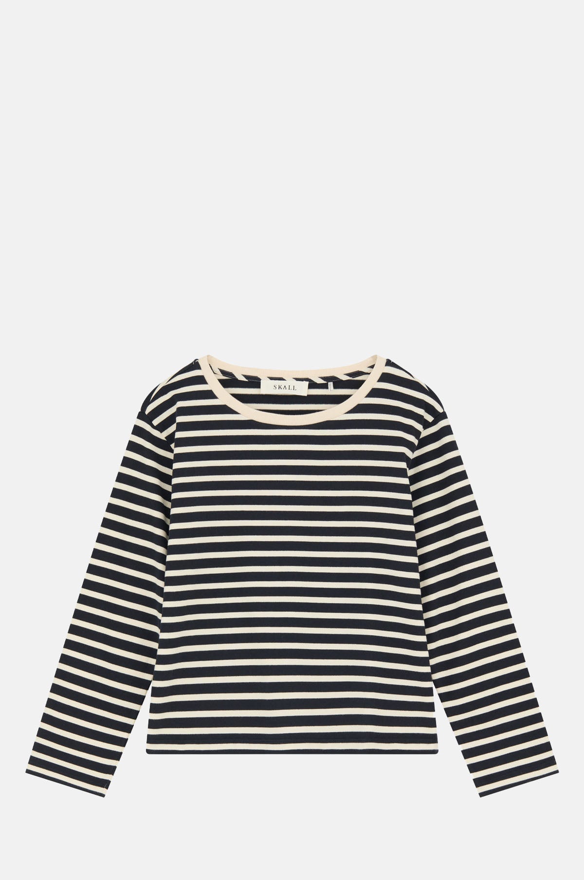 Anchoring any outfit, the Marron Blouse is a heavyweight cotton long sleeved t-shirt. With an oversized fit, it is patterned in a timeless navy and ecru Breton stripe and features a wide boat neckline. An essential addition to a well curated closet.