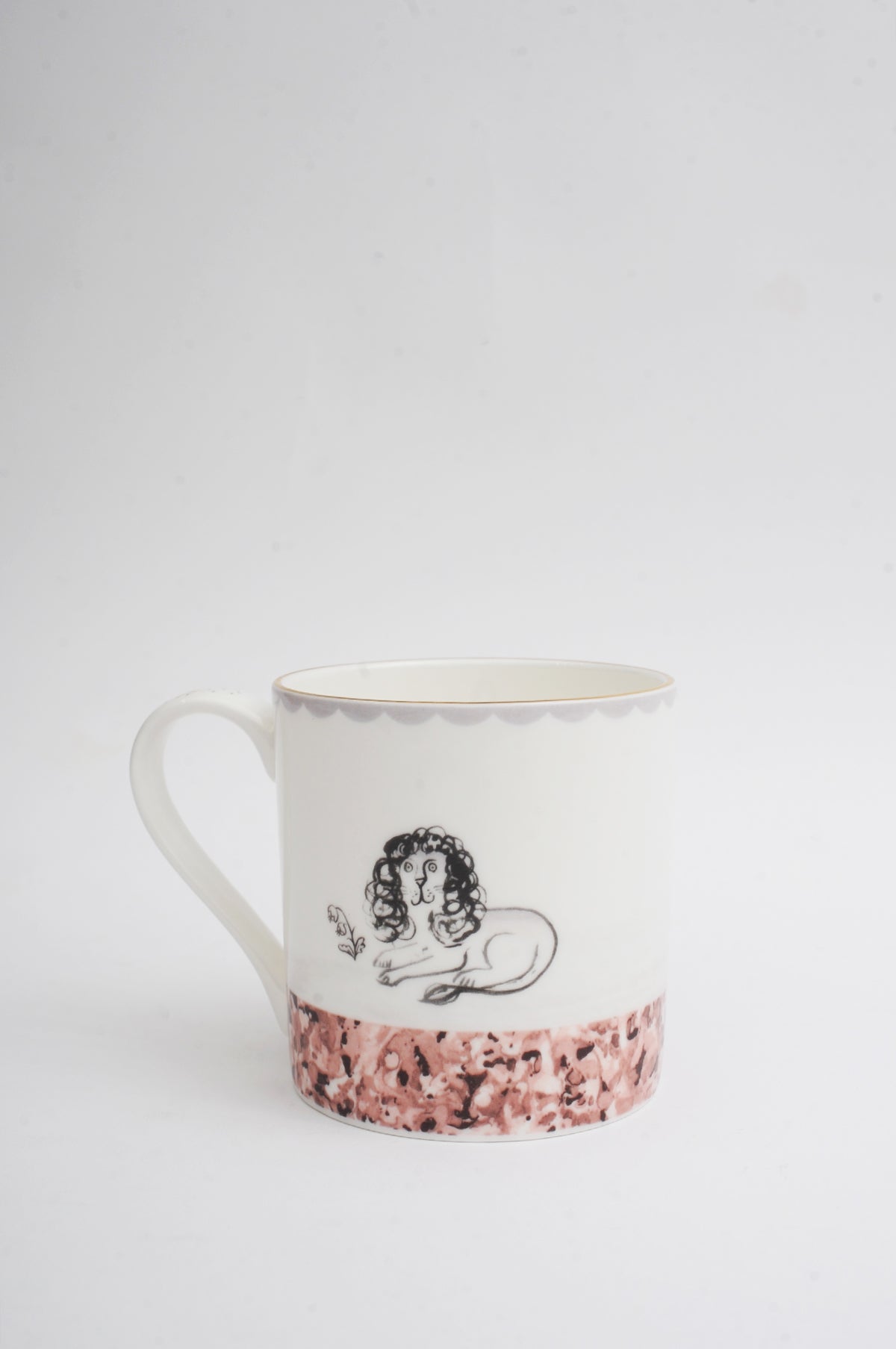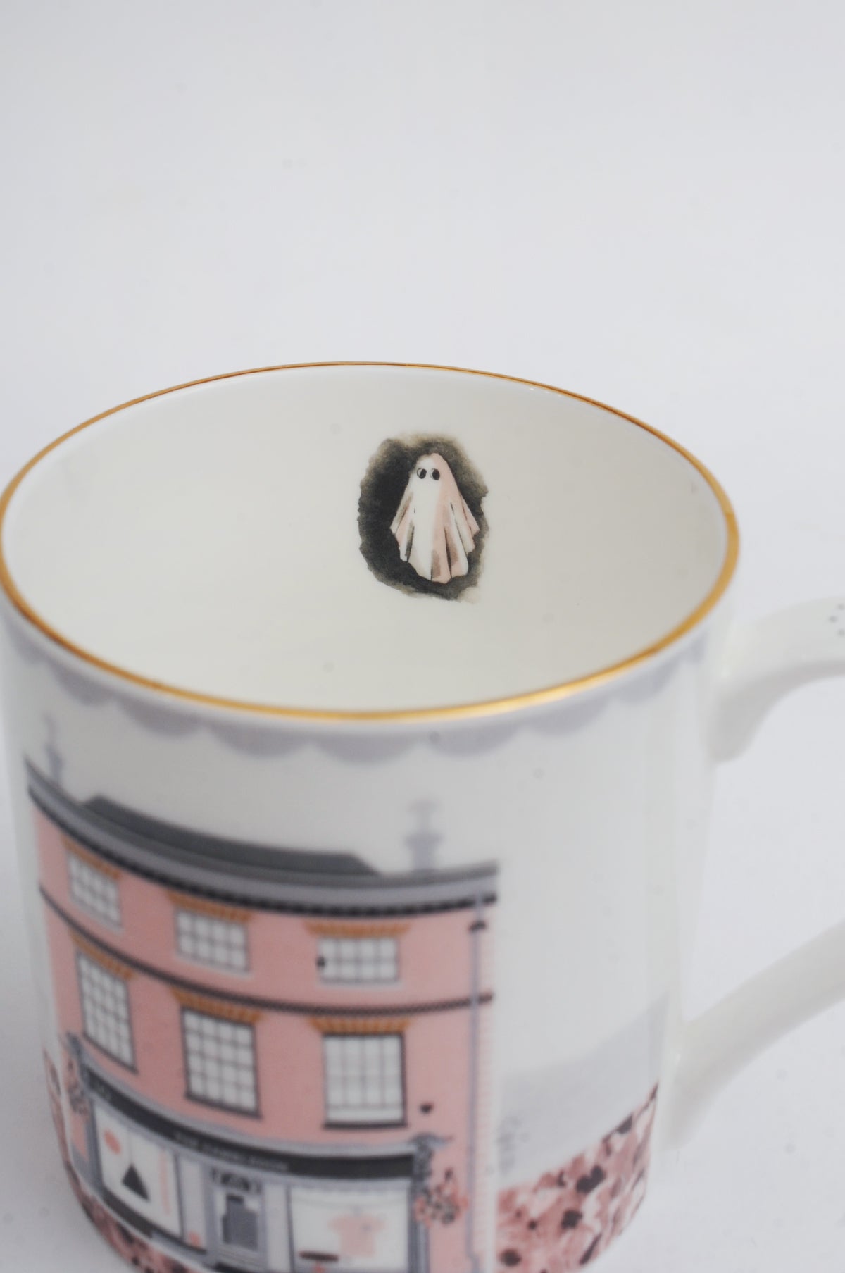 Hand decorated in Stoke by our new friends Mark and Eileen, The Hambledon mug is made of bone china, in a palette of pinks, greys and washed out black. Adorned with our beautiful shopfront and a characterful lion (because why not?), it's generously but elegantly proportioned and complete with gold detailing around the rim. Our favourite bit? The attic ghost makes a sneaky appearance on the inside.
