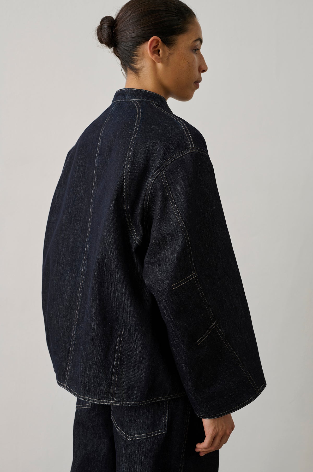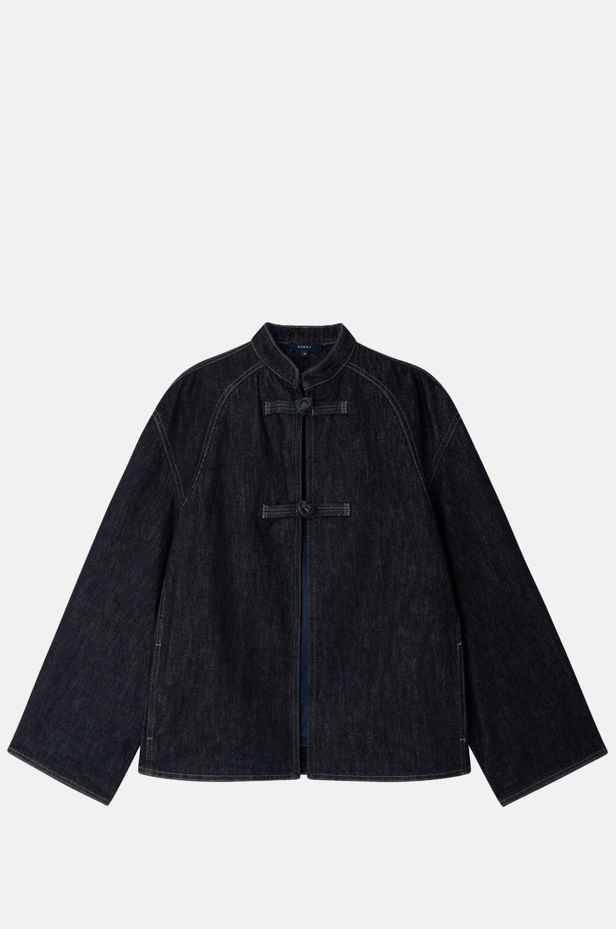 Soeur re-imagines a traditional denim jacket to deliver a contemporary counterpart with a relaxed elegance. Slightly boxy and angular with small curved lines, this dark wash denim jacket has a small stand collar and knotted toggle fastenings. An enduring style with utmost versatility to see you through the seasons.