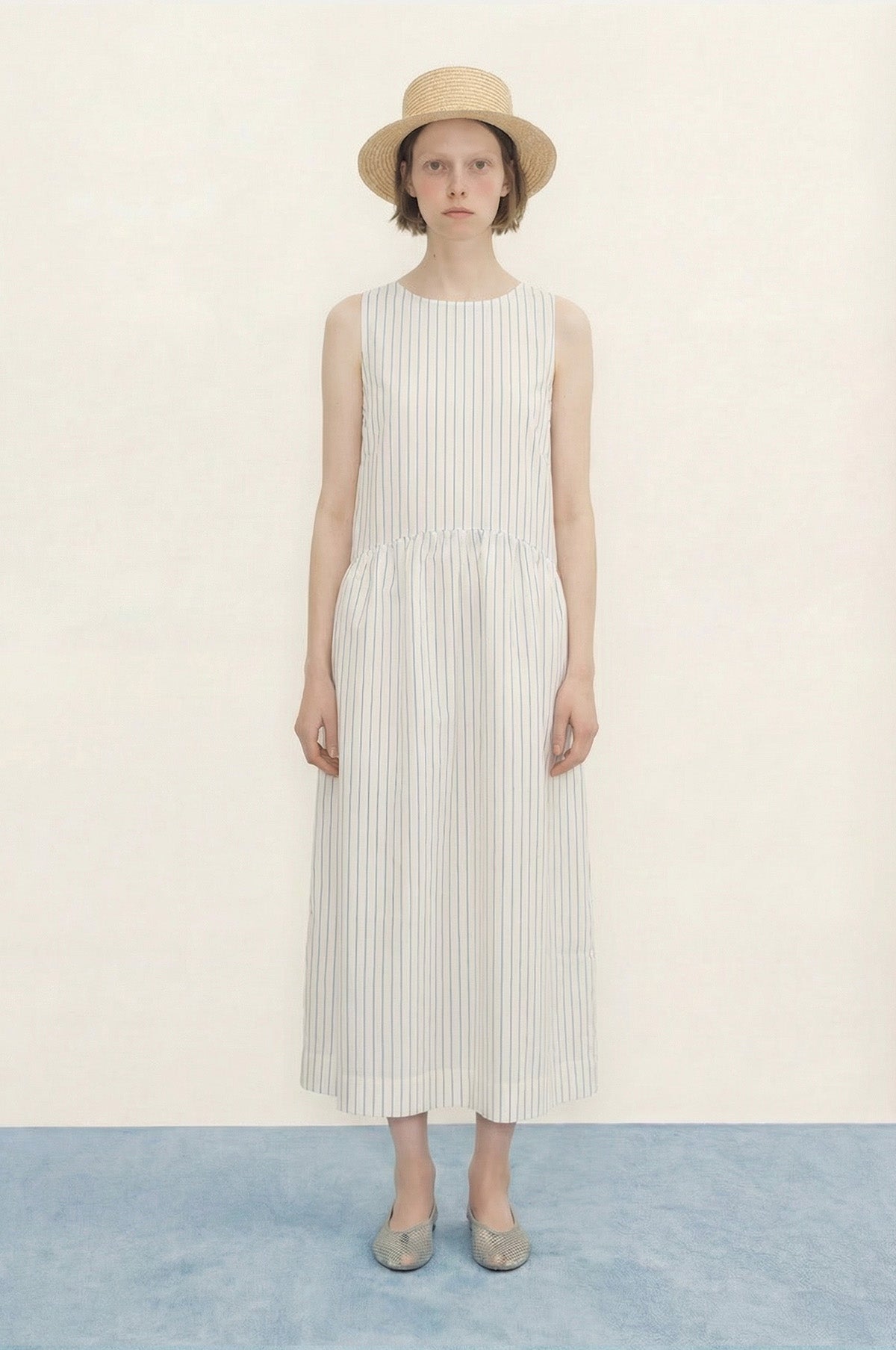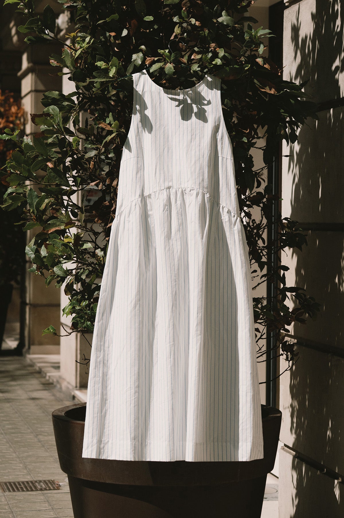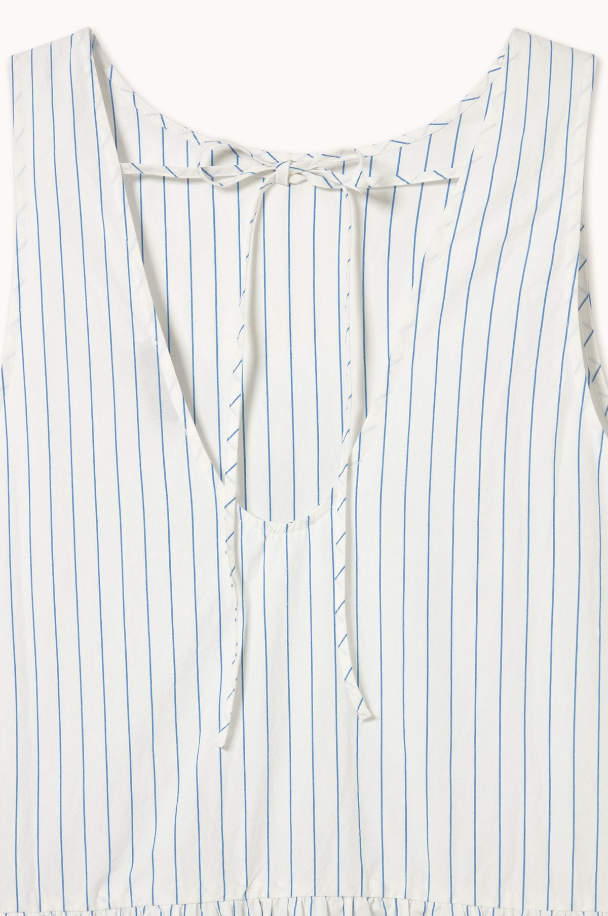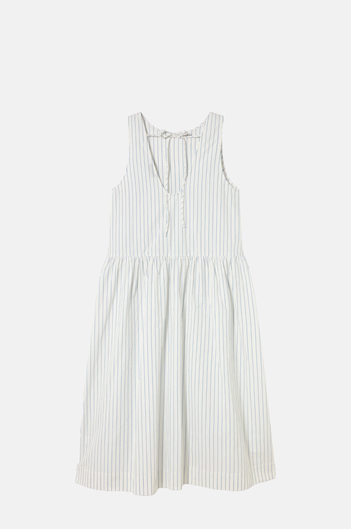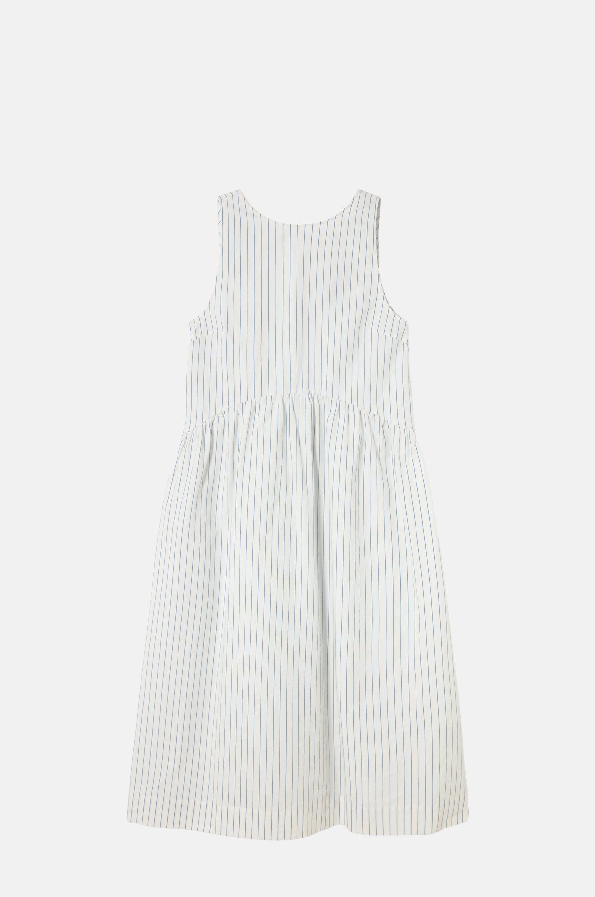 The Low Back Striped Dress from The Tiny Big Sister is crafted from a white cotton and linen poplin, featuring a relaxed, sleeveless shape with a round neckline and curved waistline. Patterned in a delicate thin blue stripe, it has a midi-length, and a scoop back finished with a tie at the nape of the neck for a subtle, elegant detail.