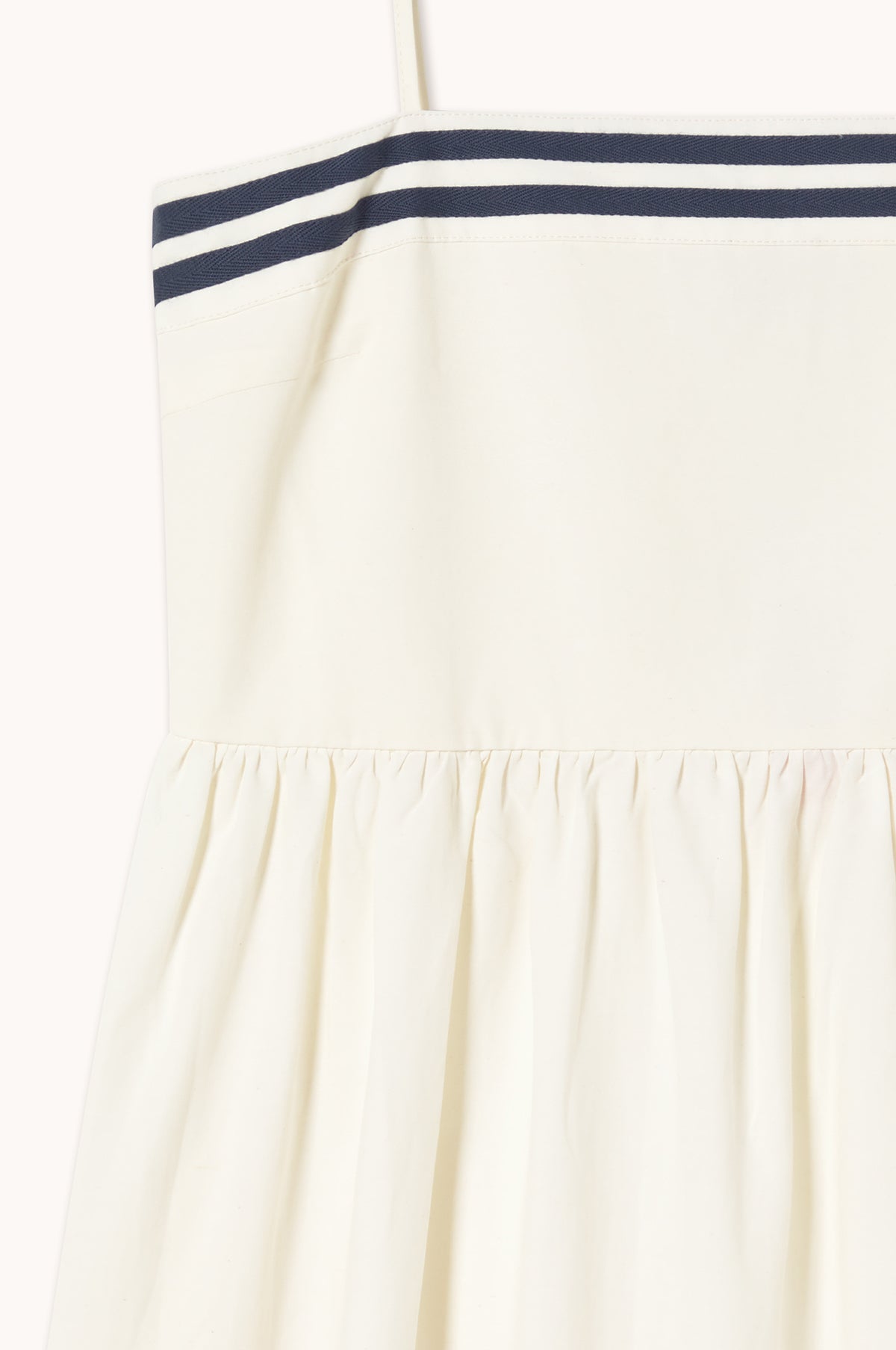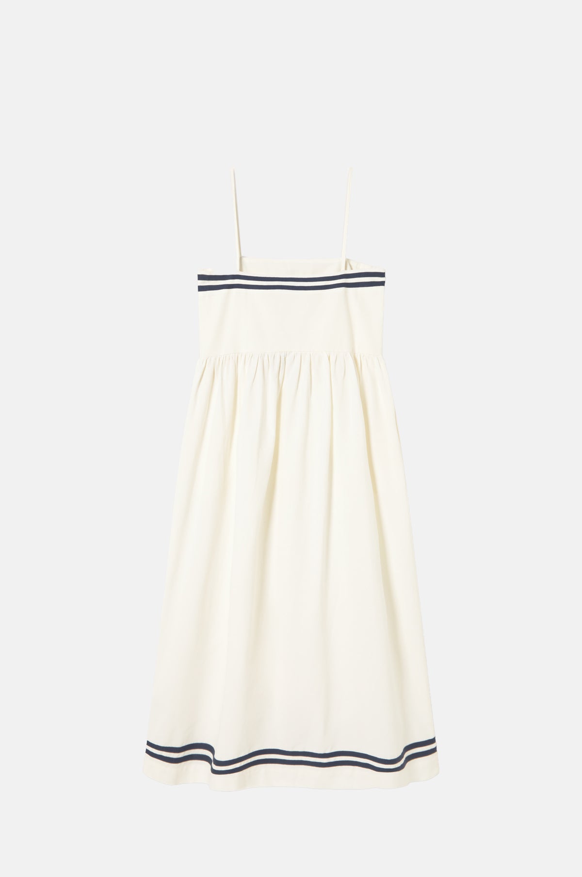 This timeless white midi dress from The Tiny Big Sister points us in a nautical direction with our attire this season. With a square neckline and spaghetti straps, this dress is accented with two pairs of contrasting navy twill stripes that inspire the seafaring sentiment. The slightly voluminous skirt, and fitted bodice create a figure flattering silhouette and the crisp, airy fabric will help to keep you cool in languid weather.