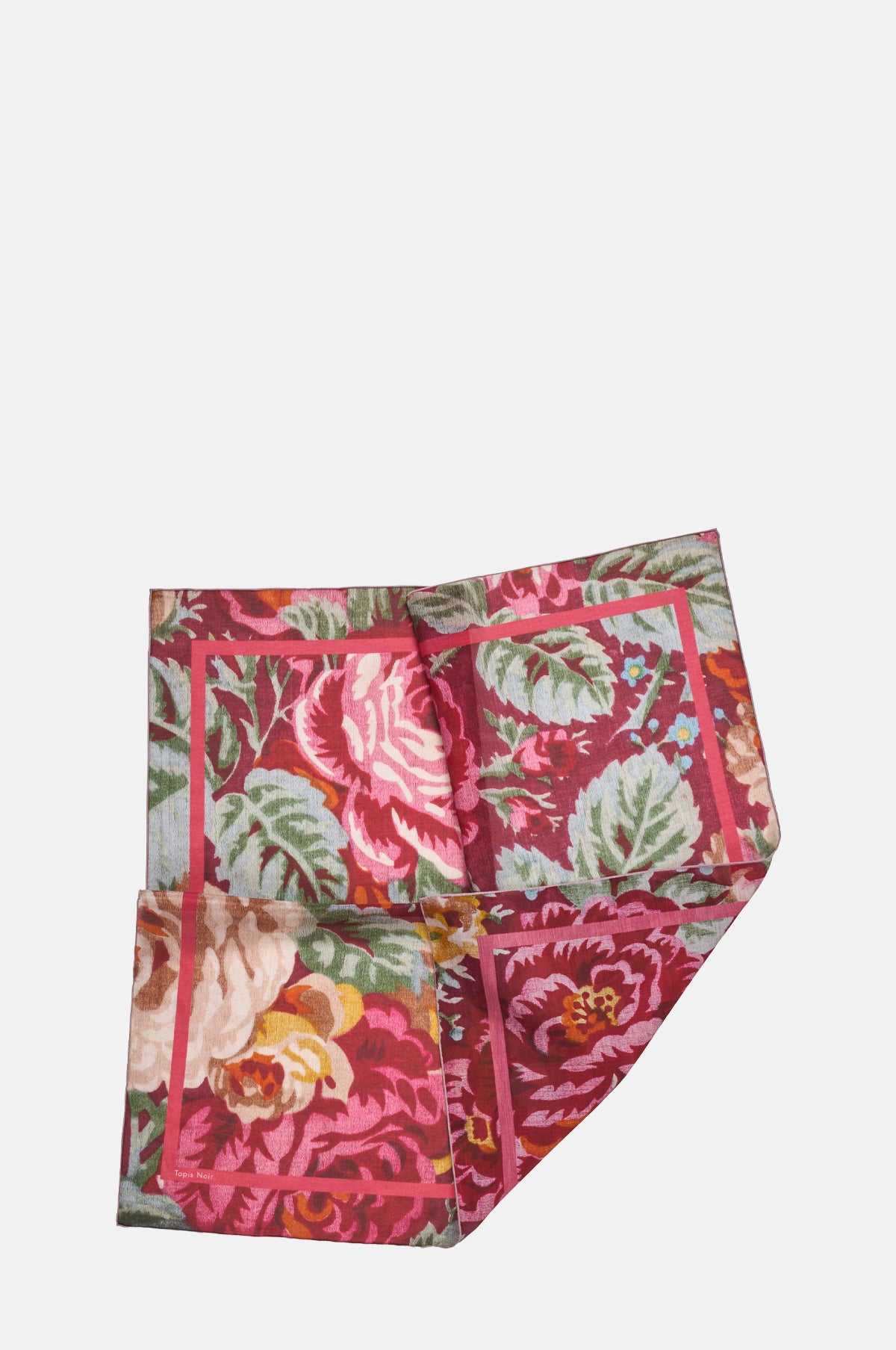This small square, beautifully soft, cotton and silk peach scarf features a floral print from their antique fabric archives that originated in France from the early 1800's. The edges have been rolled and sewn by hand - a time-intensive process that gives the scarf a very handsome hem.