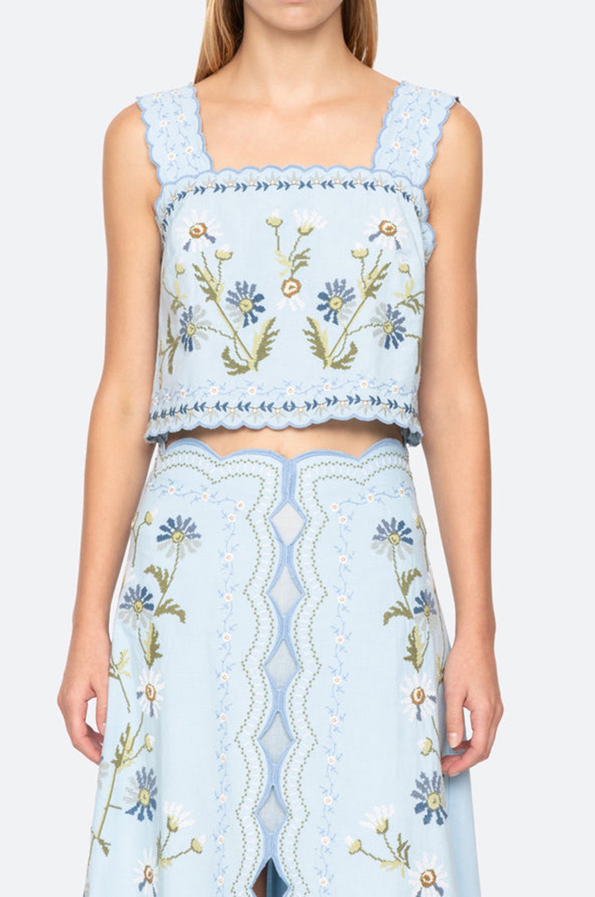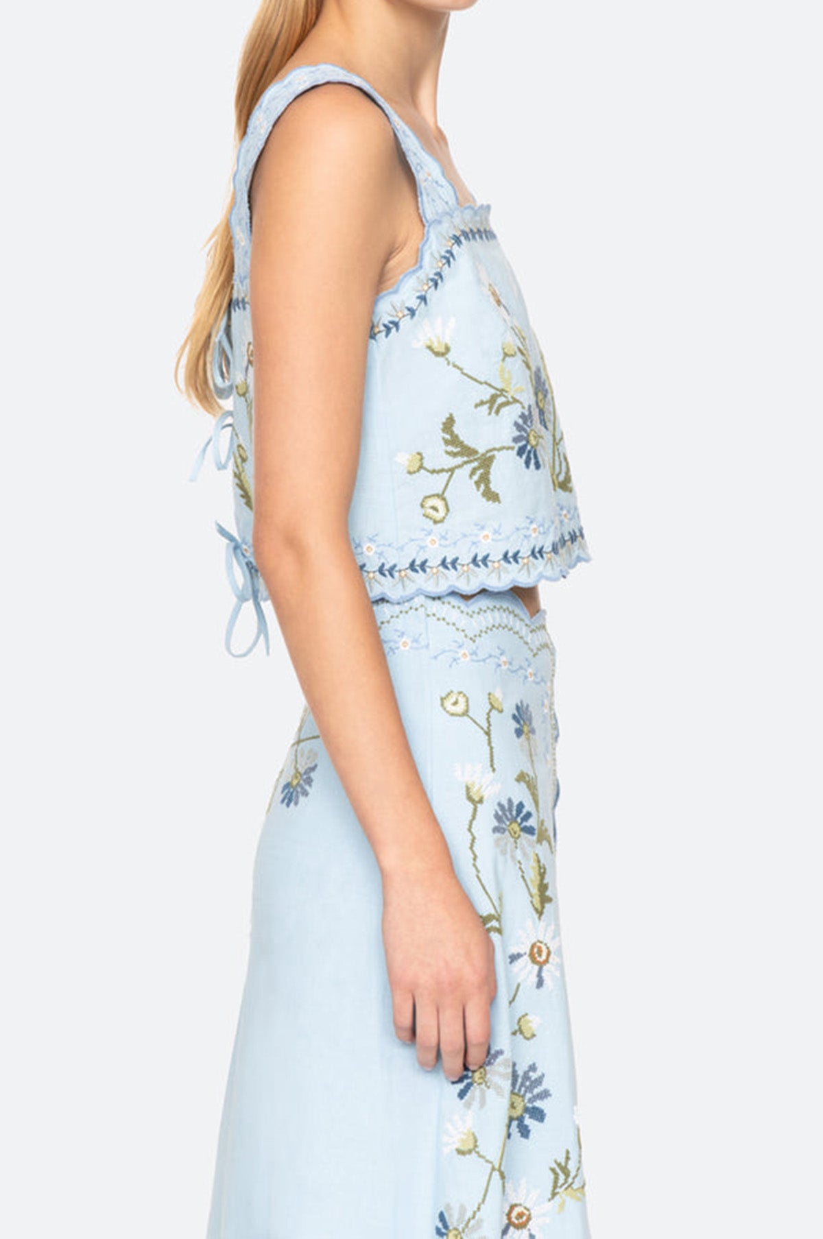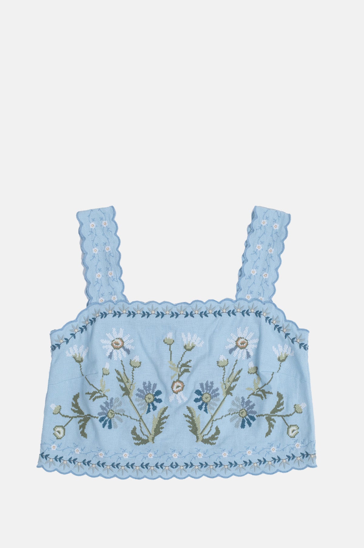 Full of charm, the Audra Tank floats over the body thanks to it loose, boxy silhouette. Easy to dress up or down this blue tank features a pair of tie closures at the back, scalloped trim and floral embroidery throughout. Made from a substantial cotton and linen blend it is soft to the touch and just the thing to wear on a a hot summer's day.