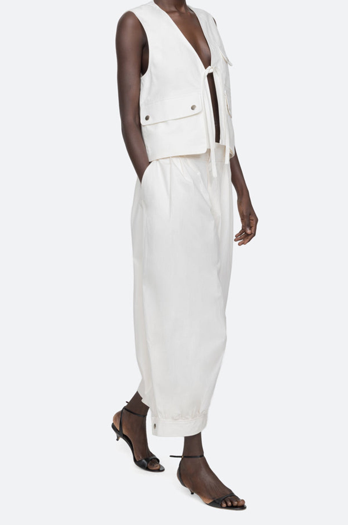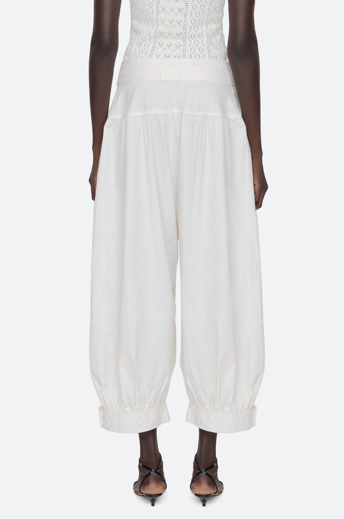 With a distinct nod to contemporary cool, the Lois Pants are crafted to a balloon silhouette with a gently cropped length and pleated detailing at the waistband. Their soft cream render is contrasted by modern silver hardware on the waistband and button fastening at the ankle. Easy to dress up or down, these trousers will be a foundational piece in your summer wardrobe.