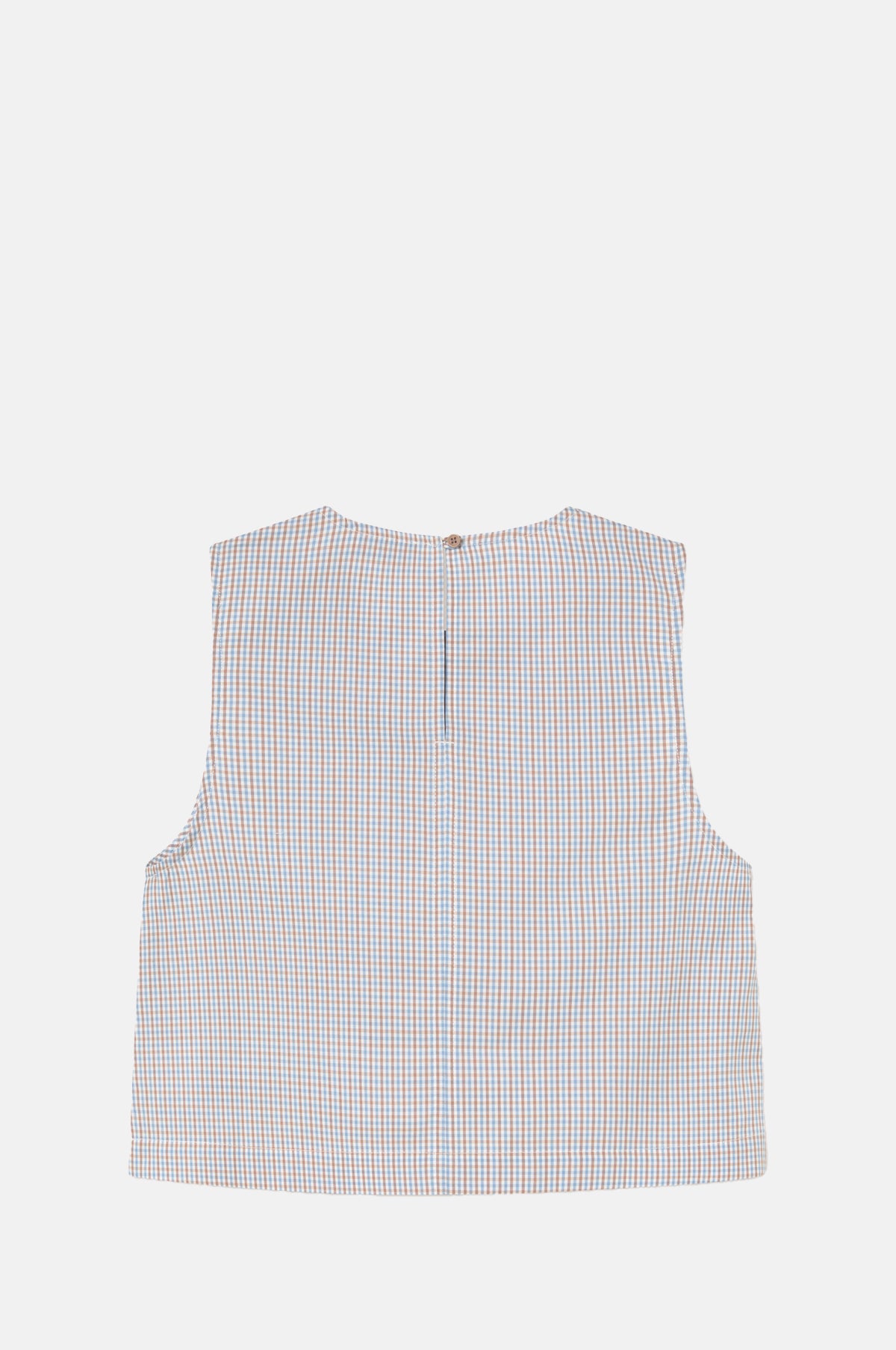 Patterned in a cheering white, blue and brown check this sleeveless blouse is made from a lightweight cotton with a fluid drape. Cut for a relaxed fit with a slight crop, it is gently shaped by under-the-bust darts. A keyhole button fastens the blouse at the back of the neck. Pair with denim shorts for an effortlessly relaxed summer look.