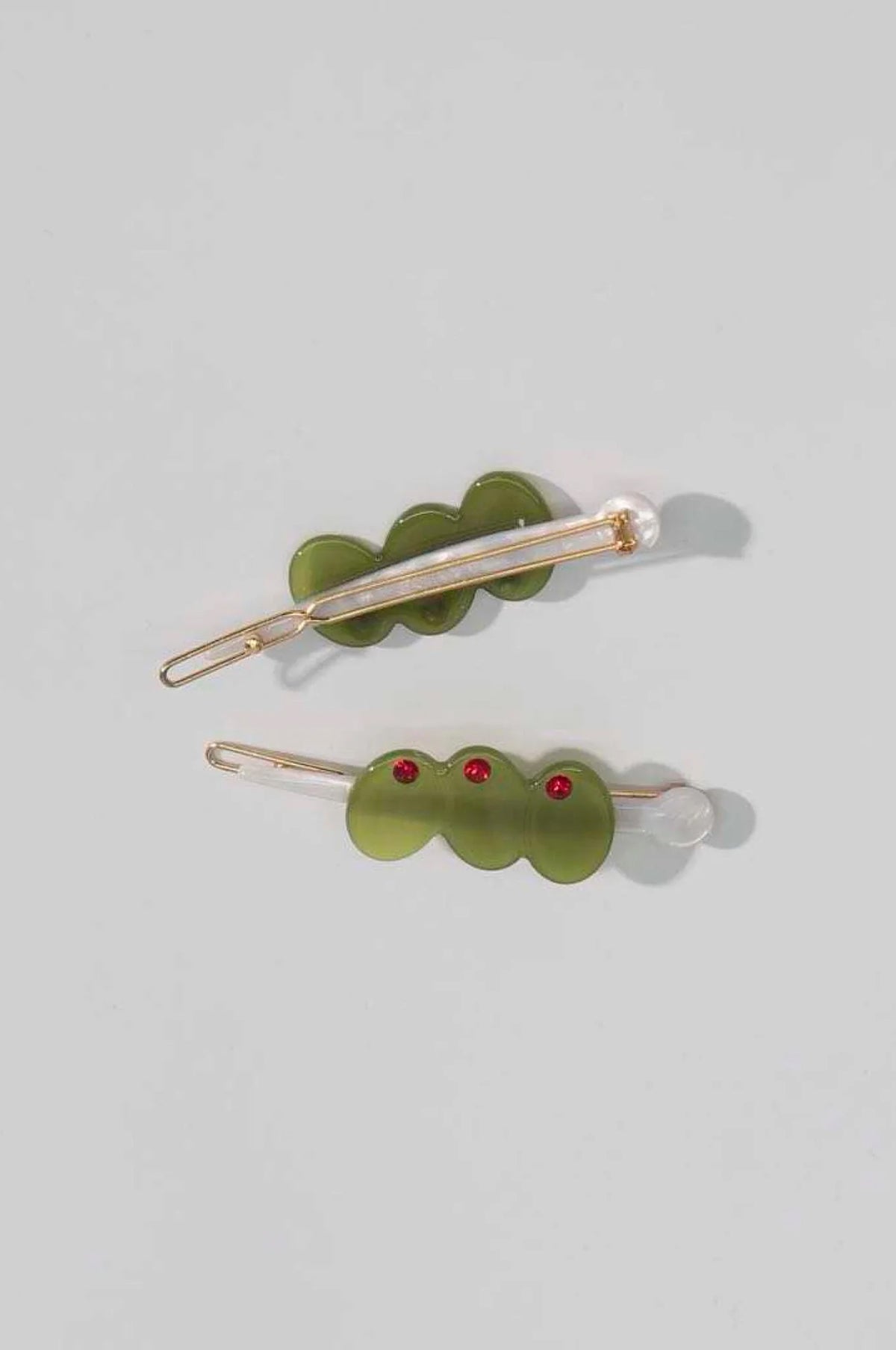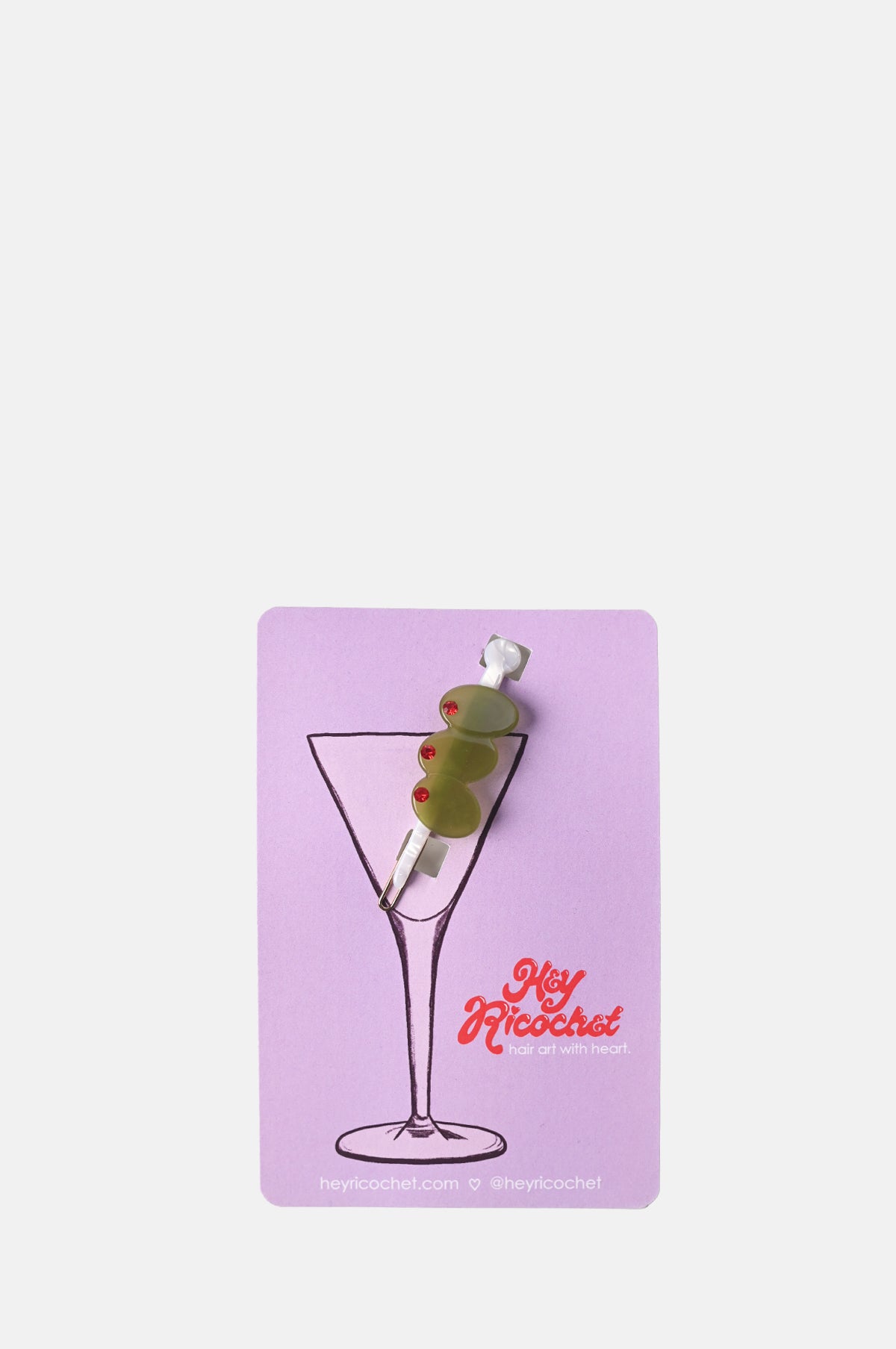 Stirred to perfection. The Extra Dirty Clip is the it girl accessory of the season, primed to keep you looking cute all throughout the season. Featuring 3 raised green olives on a shiny silver pick with a red pimento gem.