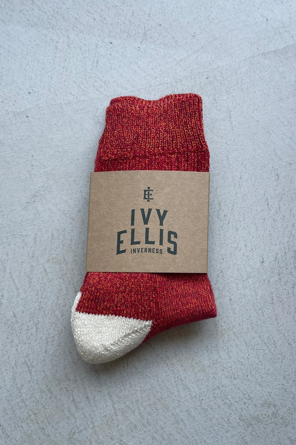 Inspired by the daring climbs of 70s and 80s California, The Sunnyside quarter length socks from Ivy Ellis reflect the vibrant yet simple attire of rock climbers in Yosemite. Each sock is crafted using three different color yarns, intertwined simultaneously, ensuring no two pairs are the same. The rich red base is complemented by a cream heel and toe, combining style and durability in one unique design.