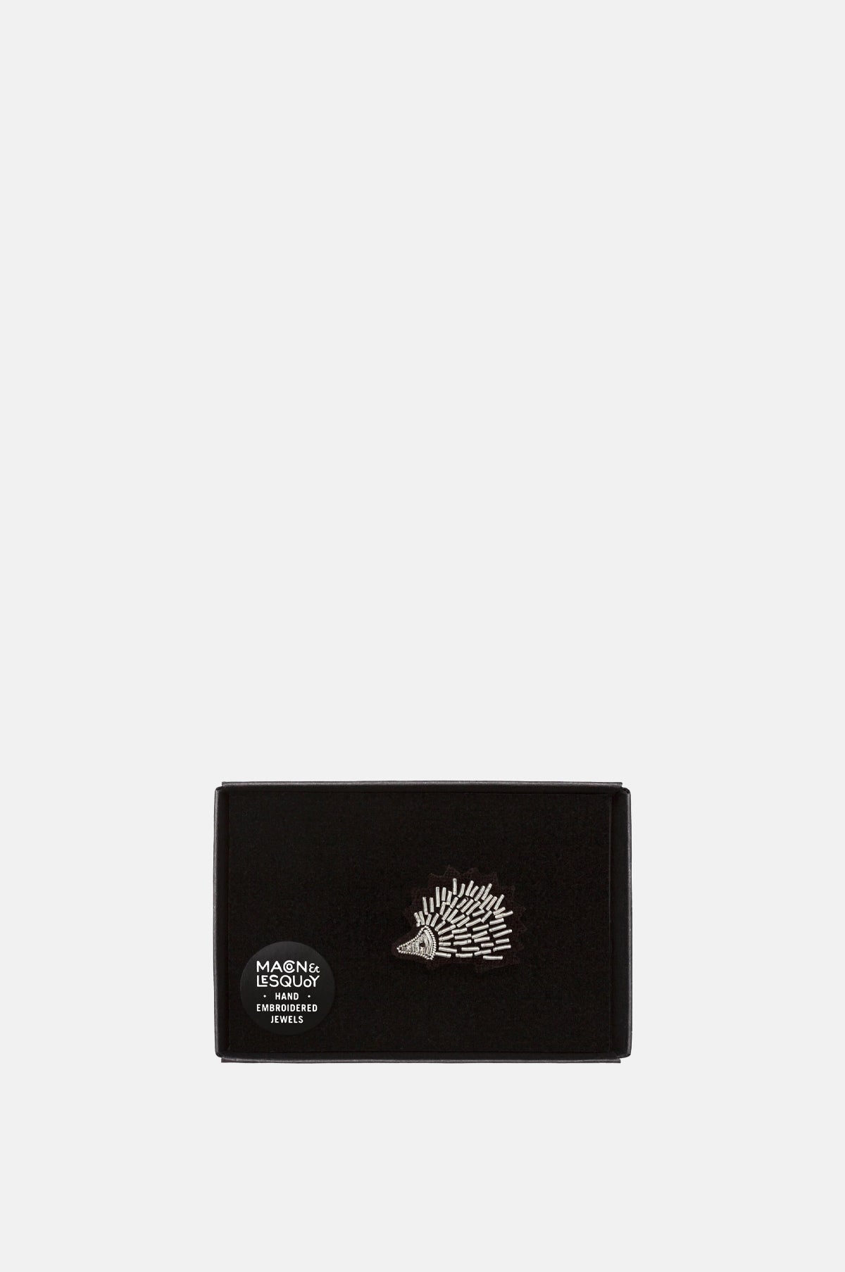This little chap is lovingly detailed with silver cannetille thread which form his prickly spikes and adorable face. He will find a happy home pinned to a shirt, coat lapel or accessorised on a bag.