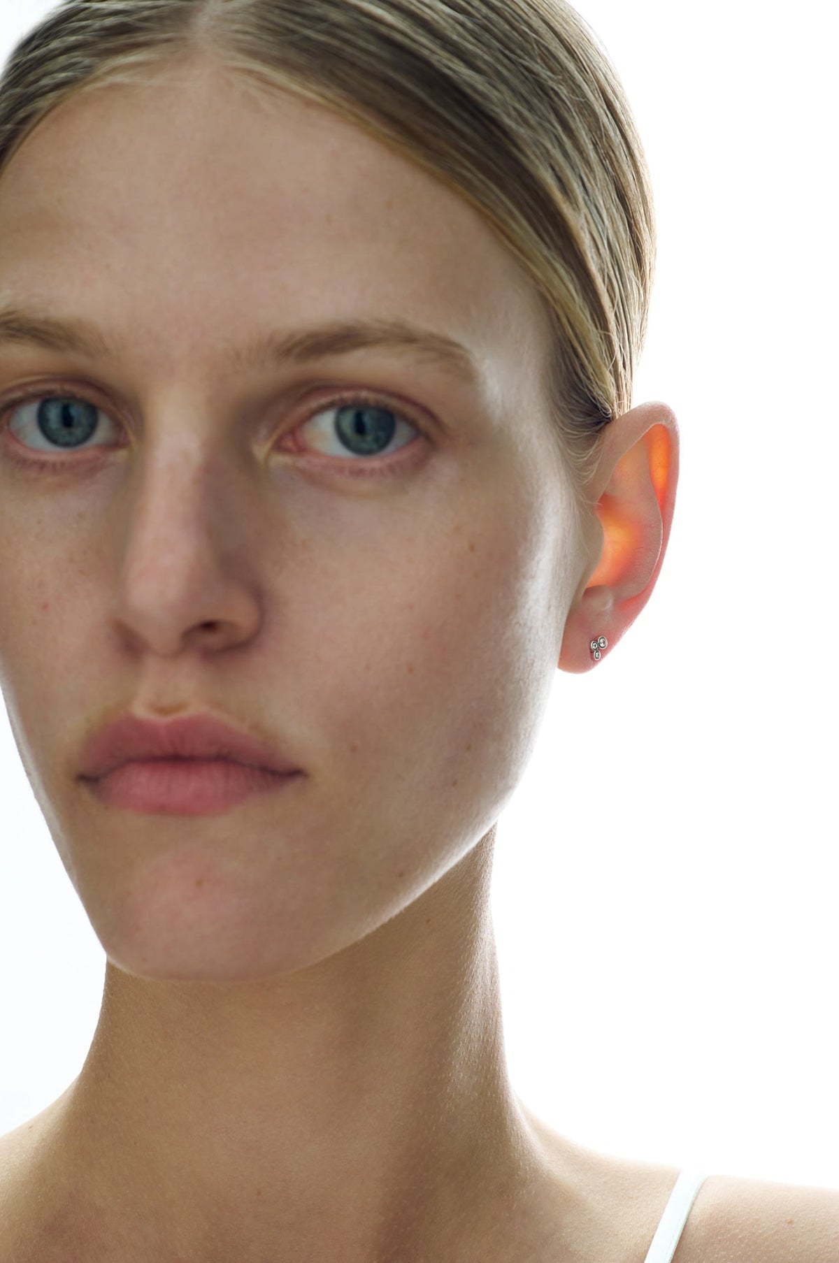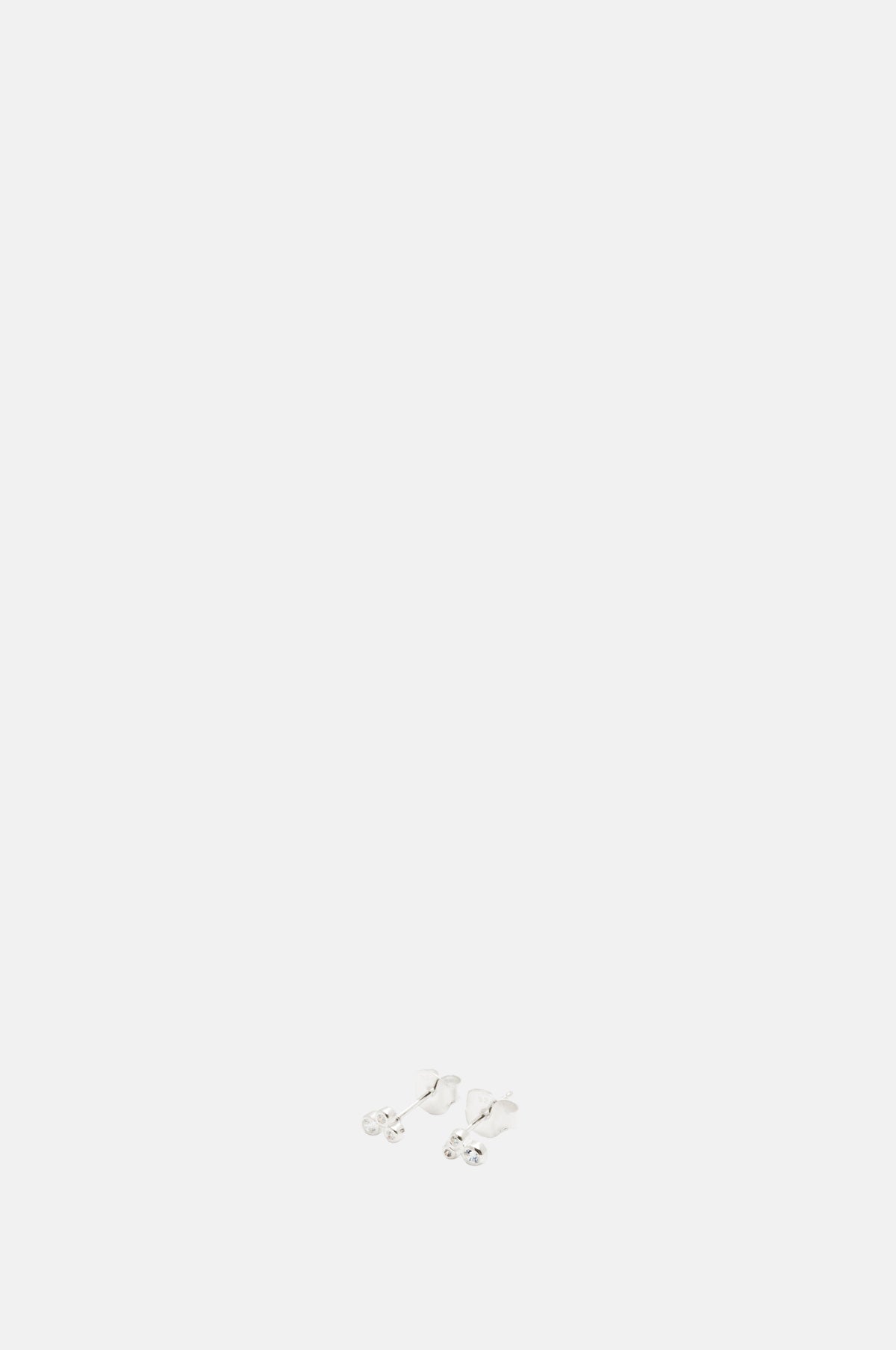 A pair of mini ear studs in 925 sterling silver, featuring three bezel-set crystal white CZ stones in different sizes. A feminine and versatile design and a perfect jewelry staple.