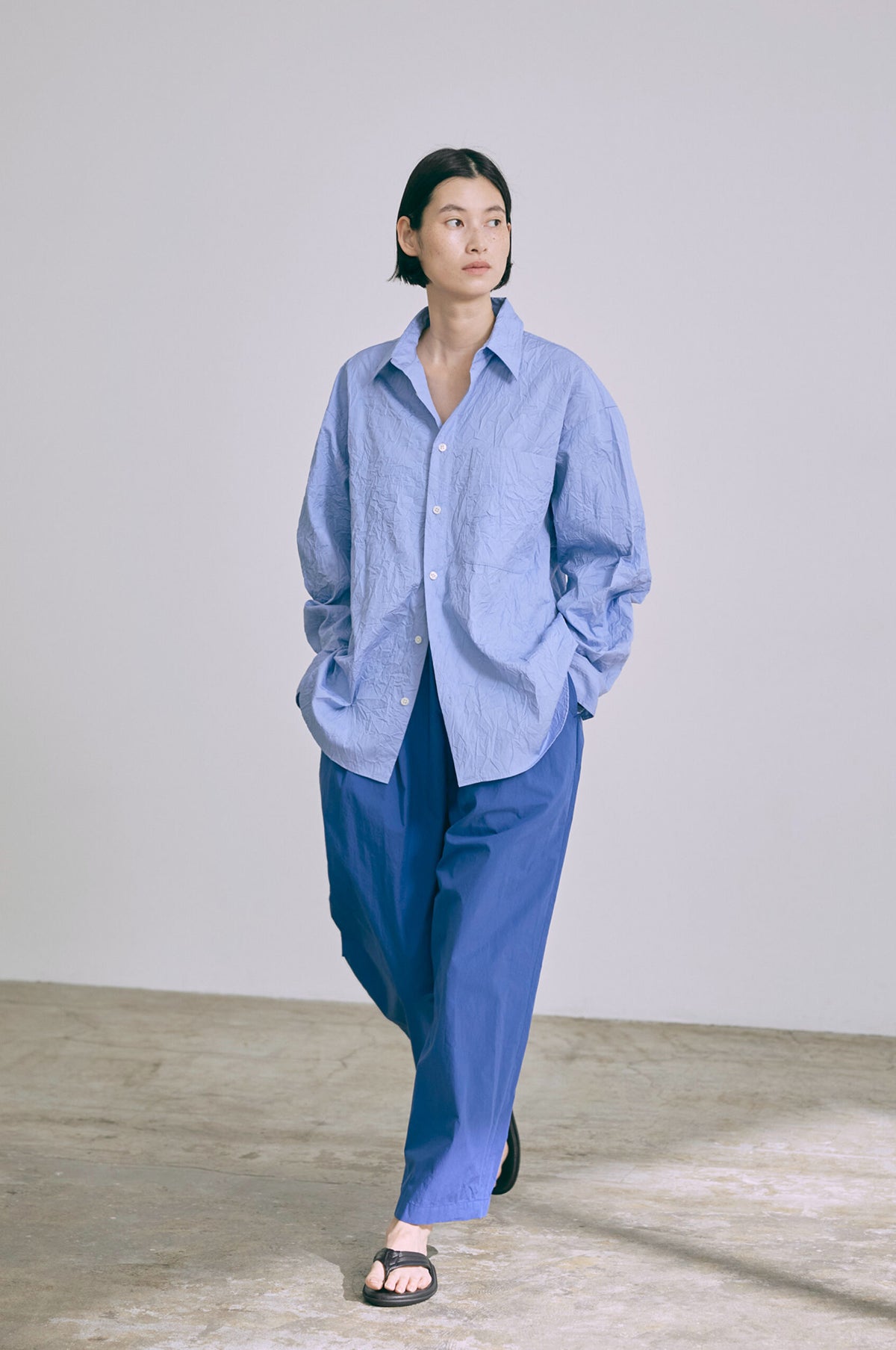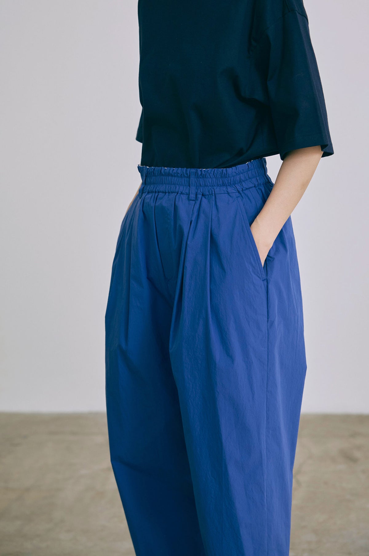The perfect blend of cool and smart, these blue trousers look fabulous on everyone. With an elasticated waist with an internal tie, belt loops and front slant pockets these trousers have a structured yet loose fit. Gathers around the waistband provide volume and their light and airy cotton construction make them ideal for warm weather.