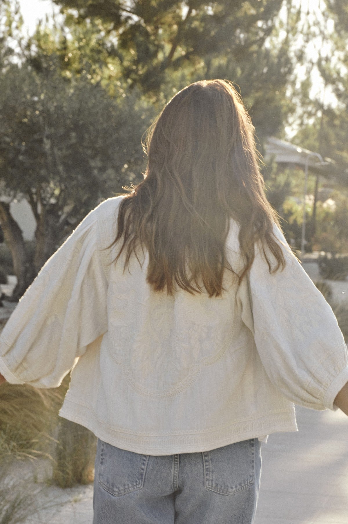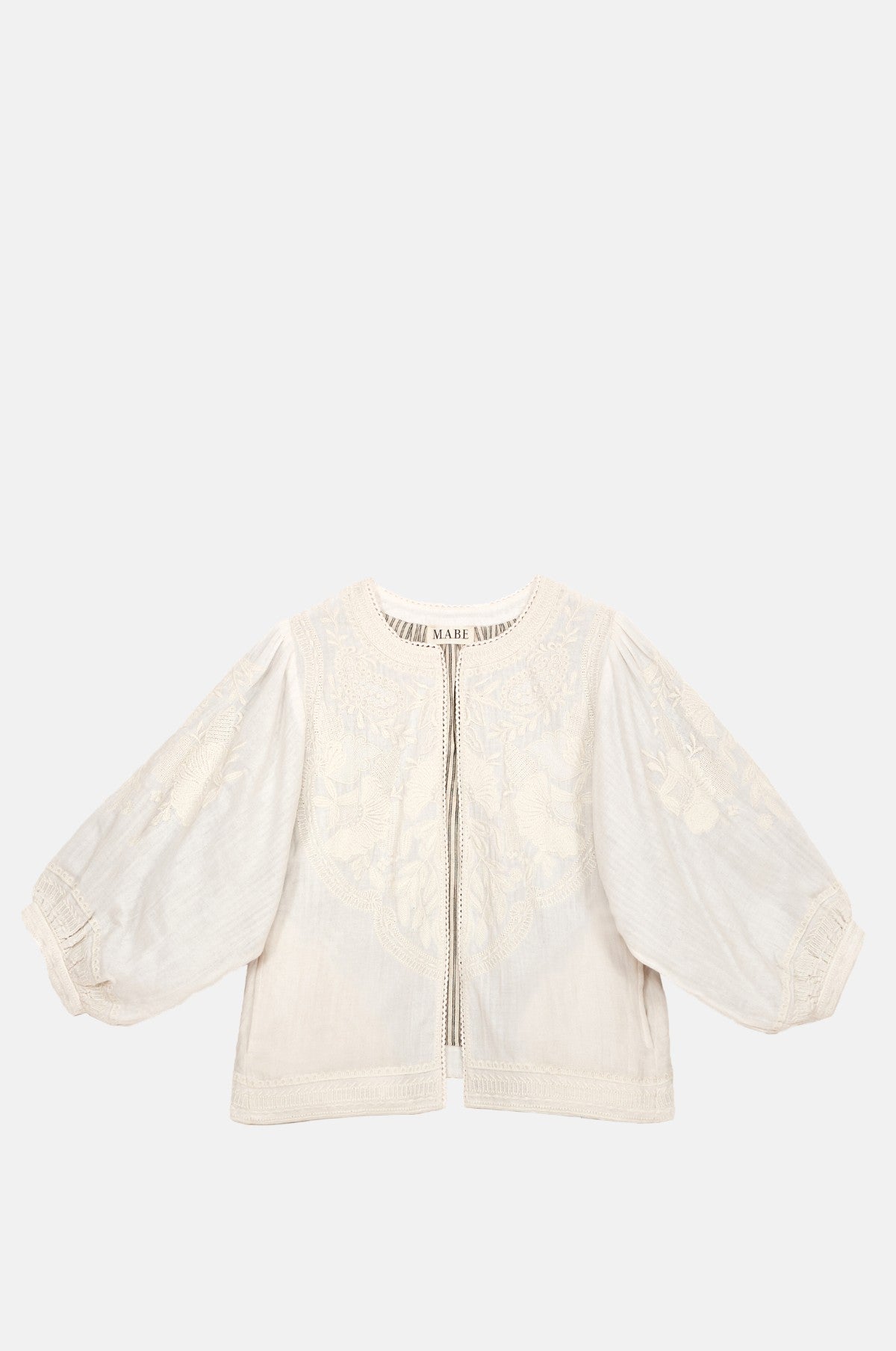 Perfect for chilly summer evenings and lightweight layering, the Averi Jacket from M.A.B.E. is a summer staple. With a straight cut and framed by voluminous gathered 3/4 length sleeves, it features tonal grey-tone ivory floral and border embroidery with a lace trim collar and striped lining. With a downy soft texture provided by its double gauze cotton body it falls just below the hips and sits perfectly above skirts and trousers.