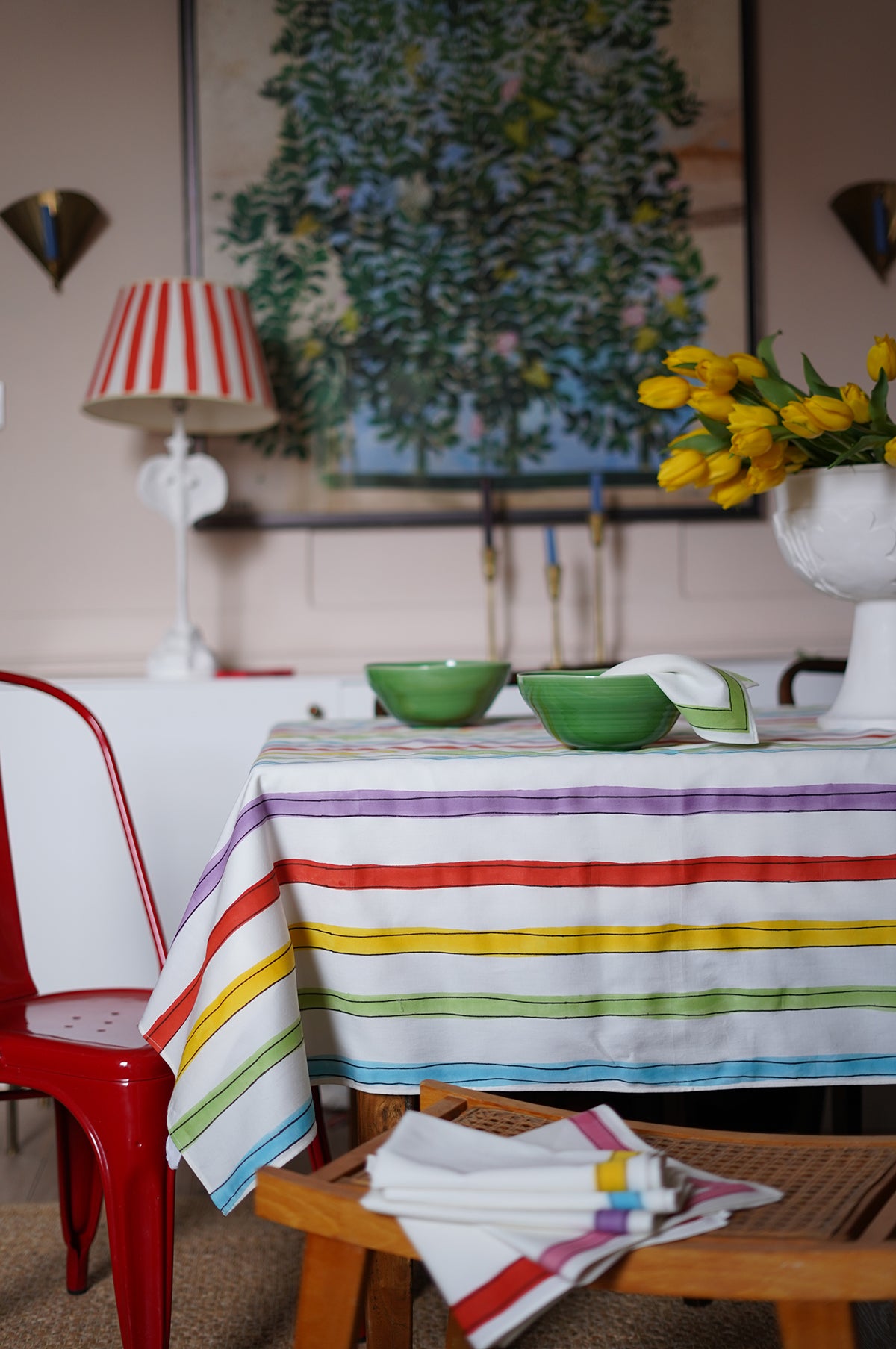 This charming collaboration between Scribble & Daub and Daydress is composed of a whimsical collection of artisan homeware that will bring joy to any well laid table. The joys of summer can never be too far away if you've set your Elsa tablecloth for lunch or supper, just add a jug of wildflowers to complete the idyll. In a gorgeous Schiaparelli inspired rainbow stripe - this will add the loveliest pop of colour to your table and is ideal for dining al fresco.