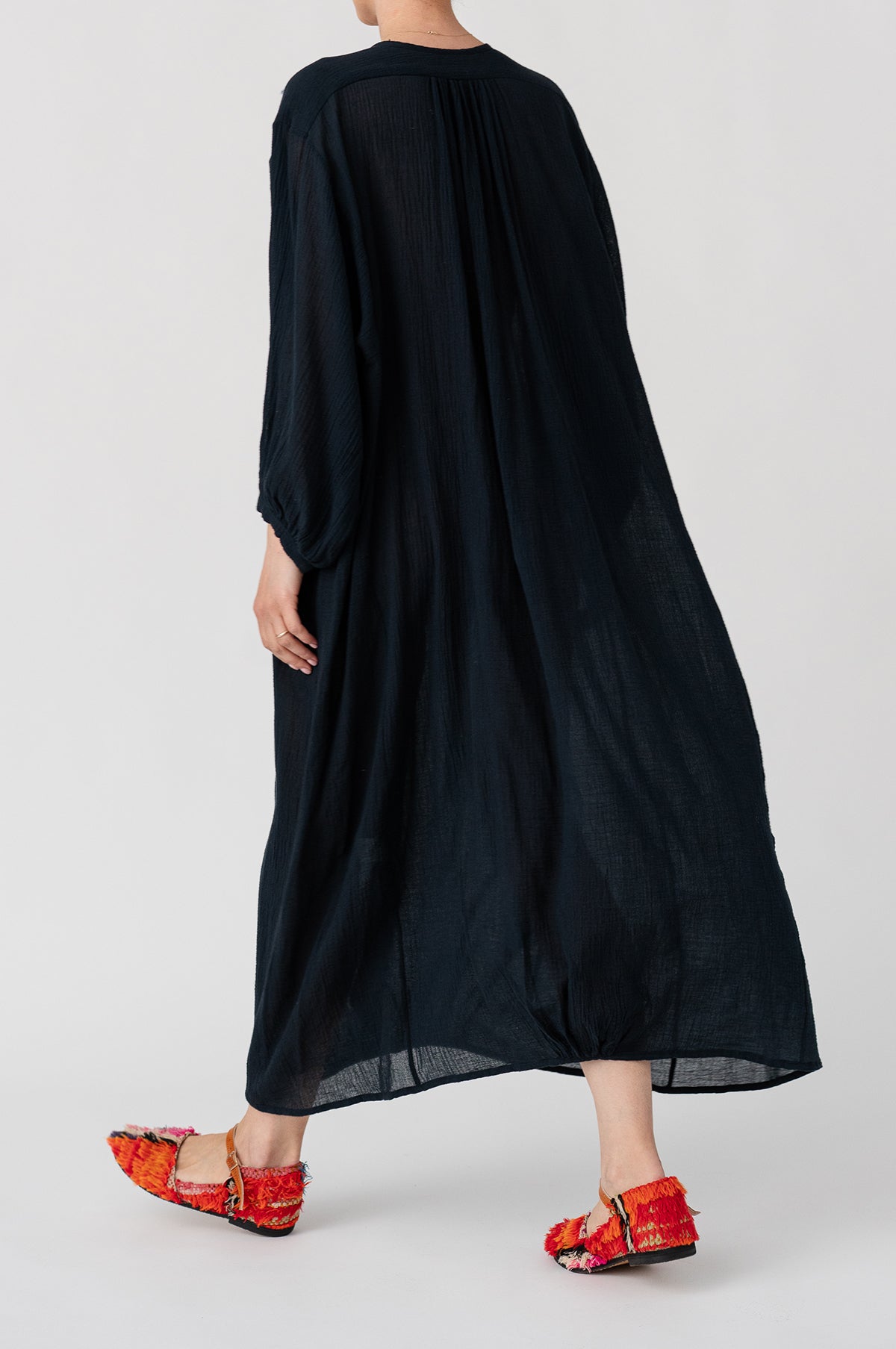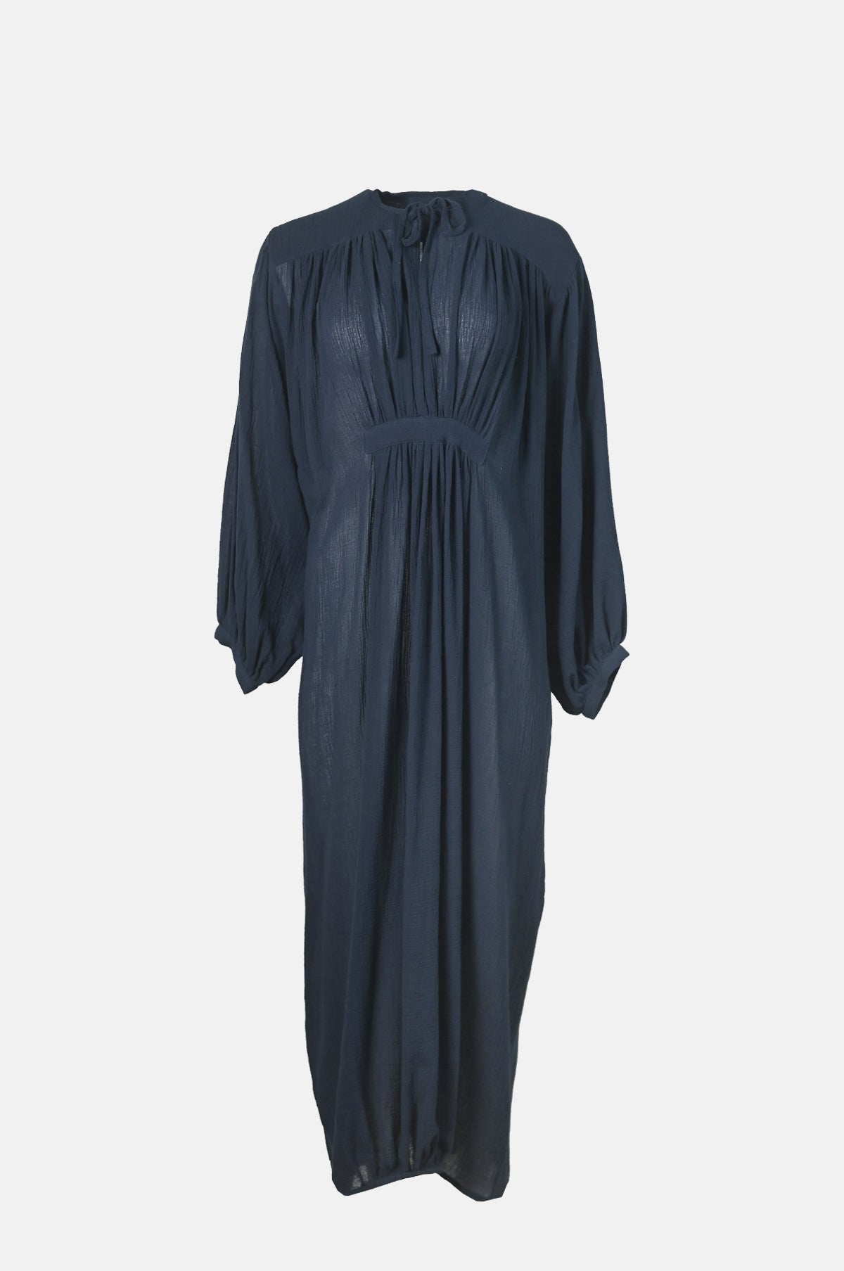 We are longing for hot summer days to don this dress on. Spun from a soft cotton navy voile, it has a loose, flowing silhouette that provides a wonderful drape and makes this dress impossibly elegant. A deep V-neck with a tie closure at the neck and gathering at the hem and shoulders provides gentle shaping. Lightweight and floaty, it will pair well with flat strappy sandals and a basket bag.